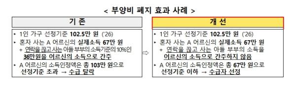 먼저, 의료급여 부양비 제도가 이재명 정부 국정과제에 따라 26년 만에 폐지된다. 부양비는 부양의무자 관련 제도 중 하나로, 부양능력 미약구간에 있는 부양의무자의 경우 소득의 일부를 수급권자에게 생활비로 지원한다고 간주하고, 이를 수급권자 소득으로 반영하는 제도이다. 현장에서는 실제로 지원하지 않는 소득을 지원한다고 가정하여 간주 부양비로도 불리었다.
