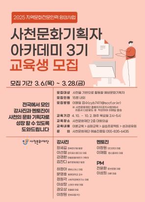 [한국제일신문, 김성옥기자] 사천문화재단은 3월 28일까지 지역문화 전문인력 양성사업‘의 사천문화기획자 아카데미’ 3기 교육생을 모집한다고 10일 밝혔다.