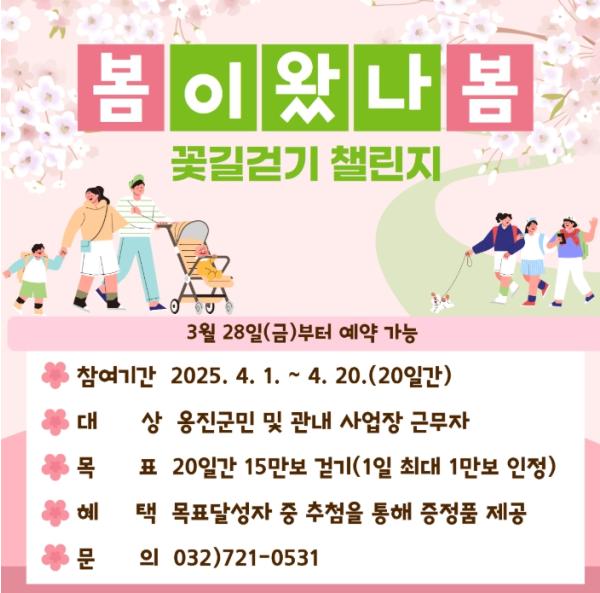 [한국제일신문, 김성옥기자] 옹진군은 오는 4월 1일부터 4월 20일까지 관내 옹진군민과 직장인을 대상으로 걷기 앱 워크온을 활용한 ‘봄이왔나봄 꽃길걷기 챌린지’를 운영한다고 밝혔다.