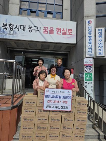 원불교 부산진교당은 4월 28일 원불교 대각개교절을 기념하여 지역사회와 기쁨을 함께하고자 교도들이 직접 담근 은혜김치를 희망나눔점빵(좌천점)에 전달했다.