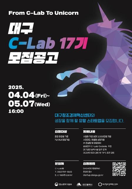 [한국제일신문, 김성옥기자] 대구광역시와 대구창조경제혁신센터는 우수한 아이디어와 기술을 보유한 초기 창업기업의 성공적인 사업화와 스케일업을 지원하기 위한 ‘대구 C-Lab 액셀러레이팅 17기’ 참여기업을 오는 5월 7일까지 모집한다.