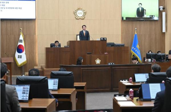 최길영 의장은 개회사에서 “산불로 피해를 입으신 분들께 깊은 애도와 위로의 뜻을 전하며, 진화와 피해 복구를 위해 도움을 주신 모든 분들께 감사드린다”며 “피해 복구, 일상 회복, 그리고 예방을 위한 대책 마련에 의회도 함께하겠다”고 밝혔다.