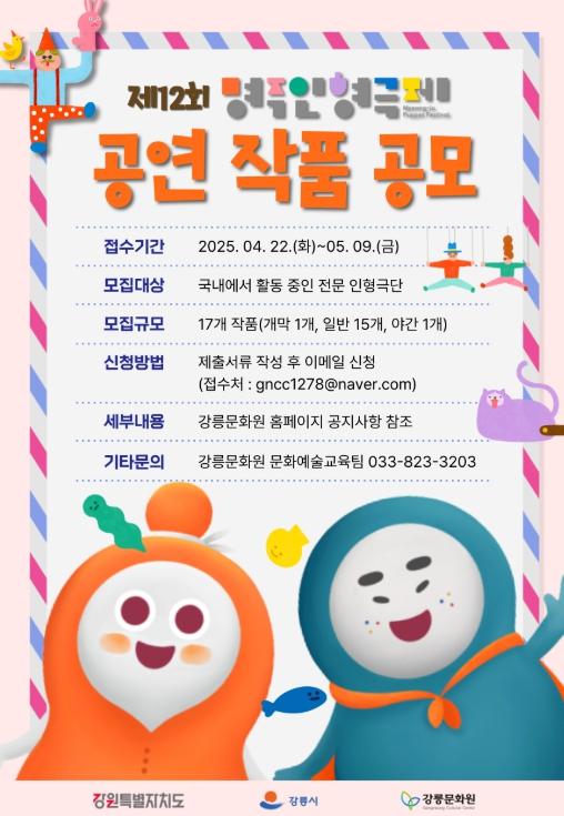 [한국제일신문, 김성옥기자] 강원특별자치도와 강릉시가 후원하고 강릉문화원이 주관하는 제12회 명주인형극제가 오는 4월 22일부터 공연작품을 공모하며 그 시작을 알린다.