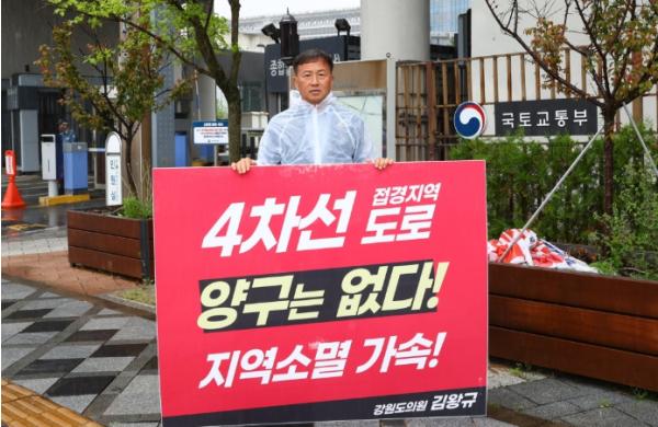 [한국제일신문, 김성옥기자] 강원특별자치도의회 김왕규 의원은 22일 세종시 정부청사 앞에서 접경지역의 열악한 도로 사정과 사회기반시설(SOC) 확충의 필요성을 알리기 위한 1인 시위를 진행했다.