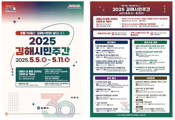 이 기간 김해시‧군 통합 30주년 기념하기 위한 기념식과 함께 민간기록물 전시회, 기념음악회, 문화나눔 가족한마당, 불꽃축제(17일) 등 통합 30주년의 의미를 담은 행사와 프로그램을 선보인다.