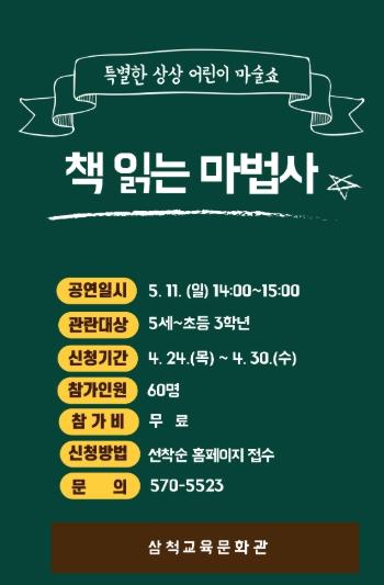 [한국제일신문, 김성옥기자] 삼척교육문화관은 5월 11일 14시 극단 ‘퍼플’의 특별한 상상 어린이 문화 공연 ‘책 읽는 마법사’를 운영한다.