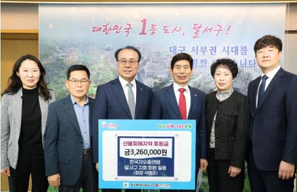 [한국제일신문, 김성옥기자] 대구 달서구는 한국자유총연맹 달서구지회로부터 산불 피해 지역 지원을 위한 후원금 326만원을 기탁받았다고 23일 밝혔다.