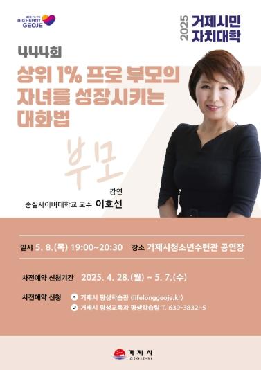 [한국제일신문, 김성옥기자] 거제시가 5월 8일 거제시청소년수련관에서 숭실사이버대학교 이호선 교수를 초청해 ‘제444회 거제시민자치대학’을 개최한다고 밝혔다.