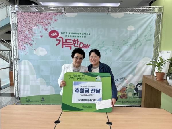 이번 후원은 평택북부청춘대학 학생들이 자발적으로 모금 활동에 참여해 마련한 것으로 이웃을 향한 따뜻한 마음과 나눔을 실천하고자 준비했으며, 전달받은 후원금은 장애 당사자의 프로그램 활동 지원을 위하여 쓰일 예정이다.
