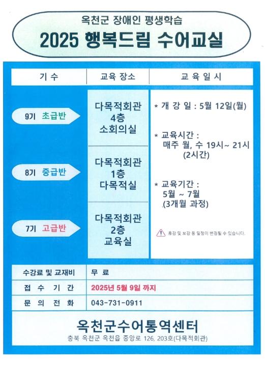 [한국제일신문, 김성옥기자] 옥천군이 장애인 평생학습도시 사업의 일환으로 ‘2025년 행복드림 수어교실’ 수강생을 모집한다.