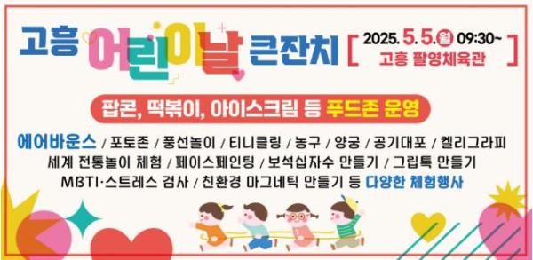 군 관계자는 “미래 고흥발전의 주역인 아이들과 가족 모두가 행복한 하루를 보낼 수 있도록 다채롭고 풍성한 행사를 준비하고 있다”며, “안전하고 따뜻한 어린이날이 될 수 있도록 최선을 다하겠다”고 전했다.
