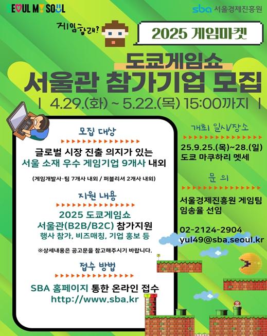 서울시는 서울의 우수한 게임콘텐츠 홍보와 게임 기업의 글로벌 진출 기회를 확대하기 위해 ‘2025 도쿄게임쇼(Tokyo Game Show, TGS)’와 ‘지스타(G-STAR, 부산)’에서 서울관을 운영한다고 밝혔다. 이와 관련해 서울관 참가기업을 4월 29일부터 5월 22일까지 모집한다.