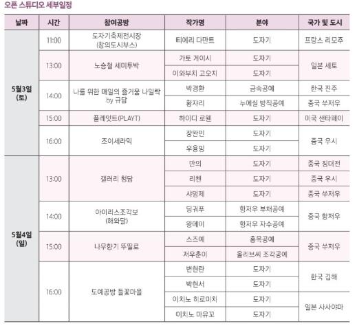 행사는 5월 3일, 도자기축제 전시장에서 하는 프랑스 리모주시 티에리 다만트 ‘작가와의 톡’을 시작으로 노승철 세미투박, 나일락공방by규담, 플레잇트, 조이세라믹에서 진행되고 5월 4일에는 갤러리 청담, 아이리스조각보(해와달), 나무향기 뚜띨로, 도예공방 들꽃마을에서 만나볼 수 있다.