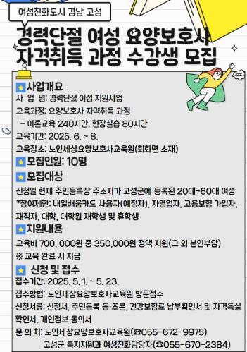 접수기간은 5월 1일부터 5월 23일까지이며, 신청 관련 자세한 사항은 노인세상요양보호사교육원이나 고성군청 복지지원과로 문의하면 된다.