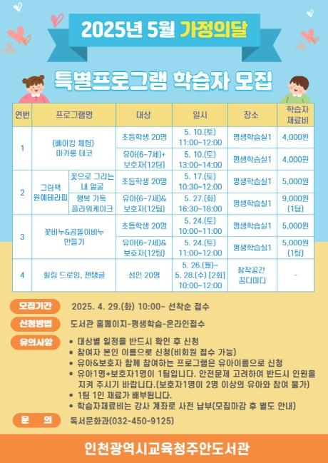[한국제일신문, 김성옥기자] 인천광역시교육청주안도서관은 지역 주민을 대상으로 5월 10일부터 28일까지‘5월 가정의 달 특별프로그램’을 운영한다.