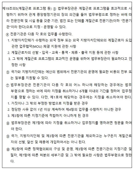 아울러 지방정부의 행정부담을 줄이고 도입 과정에서의 투명성을 높이기 위해 전문인력과 시설을 갖춘 기관, 법인 또는 단체를 '계절근로 전문기관'으로 지정·운영할 수 있는 근거도 마련됐다.