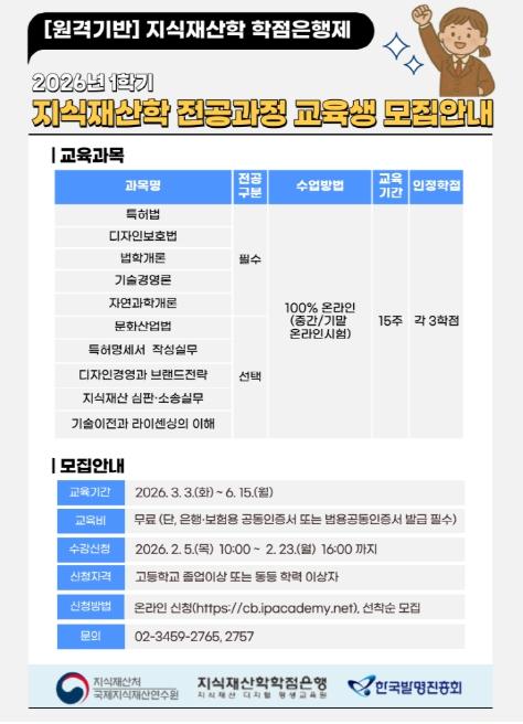 [한국제일신문, 김성옥기자] 지식재산처 국제지식재산연수원은 한국발명진흥회와 공동으로 2월 5일부터 23일까지 지식재산학 학점은행 과정에 대한 온라인 수강생을 모집한다.