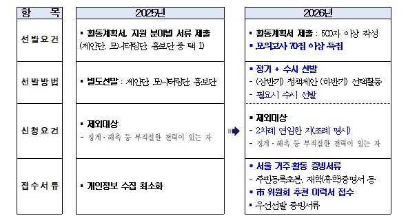 활동 방식도 청년들의 의사에 따른 자율적 참여를 기반으로 재설계했다. 기존에는 정책제안단, 모니터링단, 홍보단 등 역할별로 구분해 선발했으나, 올해부터는 역할 구분 없이 선발한다. 상반기에는 모든 참여자가 정책 제안 활동에 공통으로 참여하고, 하반기에 참여자가 희망하는 활동을 선택하도록 참여 방식을 개편했다.