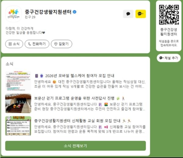 [한국제일신문, 김성옥기자] 대전 중구는 주민들에게 보다 폭넓고 신속한 건강 정보와 중구건강생활지원센터에서 추진하는 각종 사업 정보를 제공하기 위해 카카오톡 채널을 개설・운영한다고 8일 밝혔다.