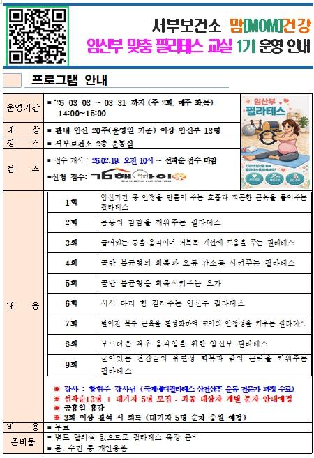 [한국제일신문, 김성옥기자] 김해서부보건소는 임신부의 신체 건강 증진과 건강한 출산을 지원하기 위해 2026년부터 처음으로'맘(MOM)건강 임신부 맞춤 필라테스 교실'을 운영 한다.
