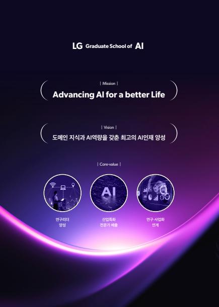 엘지(LG) 에이아이(AI) 대학원은 지난해 1월 제도가 시행된 이후, 교육부의 인가를 받아 설치된 최초의 사내대학원으로 인공지능학과 석사(입학정원 25명) 및 박사(입학정원 5명) 학위과정을 운영한다. 교육 비전은 ‘도메인(domain)* 지식과 인공지능 역량을 갖춘 최고의 인공지능 인재 양성’으로, △산업 밀착형 인공지능(AI) 실무 인재 △글로벌 기술혁신 선도 인공지능(AI) 연구 리더 △인공지능(AI) 연구와 사업화를 연결하는 인재를 체계적으로 육성함을 목표로 한다.