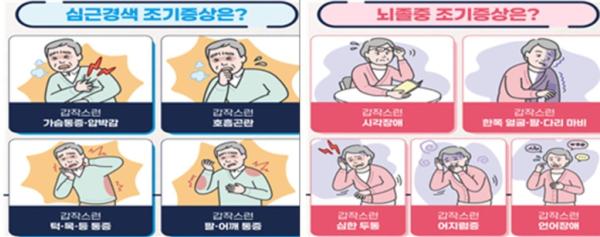 시는 심근경색 및 뇌졸중의 조기증상을 숙지하고, 의심 증상이 발생할 경우 지체 없이 119에 신고해 신속하게 전문 치료를 받을 것을 당부했다.