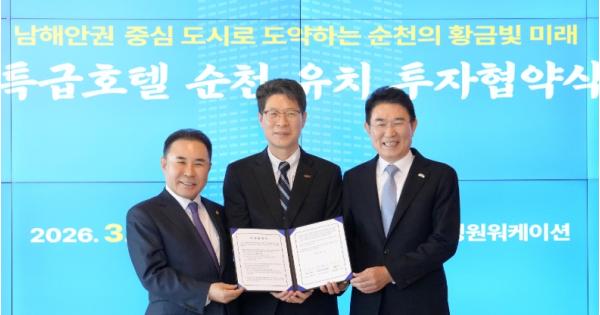 [한국제일신문, 윤진성기자] 전라남도는 13일 순천 정원워케이션센터에서 ㈜제너시스비비큐와 호텔·컨벤션 등을 포함한 복합 관광단지 조성을 위한 투자협약을 했다.