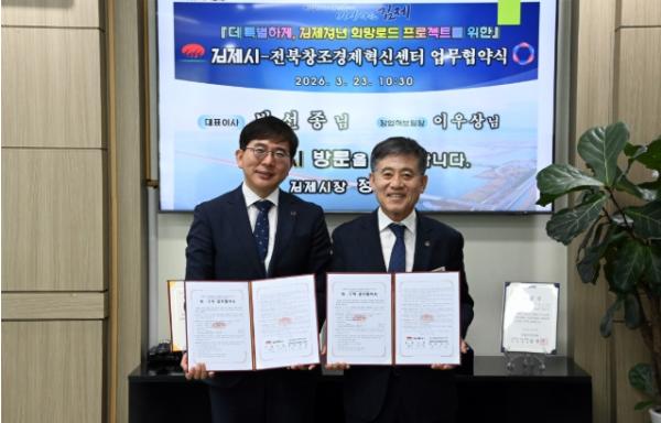 시는 본격적인 '희망로드 프로젝트'추진을 위해 23일 시청에서 정성주 김제시장, 박선종 전북창조경제센터 대표이사 등이 참석해 업무협약을 체결했다고 밝혔다.