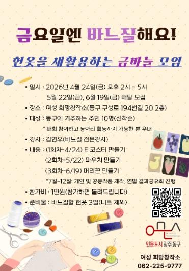 [한국제일신문, 윤진성기자] 광주 동구는 헌옷을 이용해 생활소품을 만드는 새활용 프로그램 ‘금요일엔 바느질해요! 헌옷을 새활용하는 금바늘 모임’ 참가자를 모집한다.