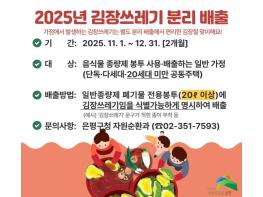 서울 은평구는 김장철을 맞아 11월 1일부터 12월 31일까지 관내 일반가정에서 배출되는 김장쓰레기를 20L 이상 일반 종량제 폐기물 봉투에 담아 배출할 수 있도록 허용한다고 밝혔다.이는 다량의 김장쓰레기