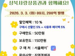 서울 성북구가 다가오는 신학기를 맞아 가계 부담 완화와 지역 소상공인 매출 증대를 위해 오는 3월 3일(화) 오전 9시부터 200억 원 규모의 ‘성북사랑상품권’을 발행한다.이번 발행은 설 명절에 이어 신학