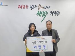 가평군 가평읍 주민 이린경 씨는 지난 20일 가평읍 행정복지센터를 방문해 취약계층 이웃돕기 성금 100만 원을 기탁했다.6년 전 가평으로 생활 터전을 옮긴 후 현재 가평읍에서 국밥 참 맛있는 집, 빡센민물
