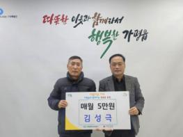 가평군 가평읍 주민 김성극 씨가 취약계층 이웃돕기 성금으로 매월 5만 원을 가평읍 행정복지센터에 정기기탁하기로 했다.지난 20일 행정복지센터에 방문한 김성극 씨는 “직장이 서울이었지만 가평이 좋아