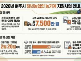 여주시는 청년농업인의 안정적인 영농 정착과 경영 기반 강화를 위해 '2026년 청년농업인 농기계 지원사업'을 추진한다.이번 사업은 관내 청년농업인이 영농에 필요한 농기계를 구입할 경우 구입비의 일부를