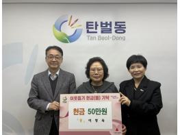 이영숙 탄벌8통장은 21일 광주시 탄벌동 행정복지센터를 방문해 취약계층 지원을 위한 성금 50만 원을 기탁했다.이번 기탁은 이 통장이 수년째 이어오고 있는 정기적인 나눔 활동의 하나로 평소 통장 업무와