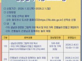 동두천시 도서문화사업소는 설날을 맞아 오르빛도서관에서 유아를 동반한 가족과 저연령 청소년을 대상으로 ‘설날 맞이 전통놀이 체험 프로그램’을 2월 4일 운영한다.프로그램 참여 신청은 동두천시 도서