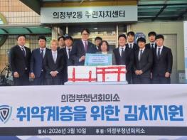의정부시 의정부2동주민센터는 3월 10일 의정부청년회의소가 저소득 독거노인을 위해 김치 50상자(2kg 단위)를 기부했다고 밝혔다.의정부청년회의소는 매년 성금, 쌀, 식료품 등의 기부는 물론, 지역 내 다