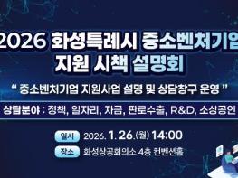 화성특례시가 관내 중소기업과 소상공인의 경영 애로 해소와 지원사업 활용도를 높이기 위해 오는 26일 화성상공회의소 컨벤션홀에서 ‘2026년 화성특례시 중소벤처기업 지원 시책 설명회’를 개최한다.이번
