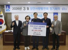 수원시 장안구 대표 봉사단체 장안사랑발전회가 지난 19일, '2026 만석거 새빛축제'의 성공적인 개최를 응원하며 지원금 200만원을 전달했다.'2026 만석거 새빛축제'는 4월 3일부터 12일까지 열흘에 걸쳐 진
