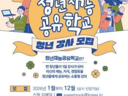 파주시는 2026년 1월부터 12월까지 청년을 대상으로 '청년재능공유학교' 청년강사를 연중 상시 모집한다.‘청년재능공유학교’는 학력·경력·전문 자격과 관계없이 청년이 또래 청년들에게 직무, 지식, 경험