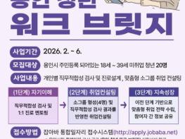 용인특례시는 2월 2일부터 10일까지 상반기 청년 맞춤형 진로 설계 프로그램 참가자를 20명을 모집한다고 27일 밝혔다.시는 상·하반기 구직활동에 어려움을 겪는 지역 청년들에게 맞춤형 취업 설계 지원 프