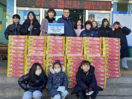 평택시 청북읍 옥길리 신도시에 있는 유승한내들퍼스트뷰 아파트 단지 내 이마트24 편의점이 지난 20일 어린이 고객들과 함께 어려운 이웃을 위한 나눔을 실천했다. 김영환 점주는 매년 두 차례, 편의점을