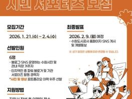 수원도시공사가 21일부터 다음 달 4일까지 2026년도 제8기 시민 서포터즈를 모집한다.수원시민과 수원 지역 직장인이면 신청 가능하며, 개인 블로그 및 SNS 등을 운영하거나 공공기관 서포터즈 경력자는 우