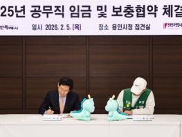 용인특례시는 5일 시청 접견실에서 시 소속 공무직 근로자를 대표하는 전국민주연합노동조합 용인지부와 ‘2025년 공무직 임금·보충 협약’을 체결했다고 밝혔다.이날 체결식에는 이상일 시장과 최승덕 전국