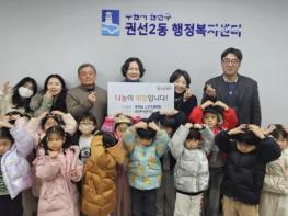 수원시 권선구 권선2동에 소재한 화성어린이집는 지난 27일, 권선2동행정복지센터를 방문해 사랑의 후원금 1,572,800원을 기탁했다.이번 후원금은 지난 1년간 원아들이 손수 텃밭에 심은 상추를 수확하여 판