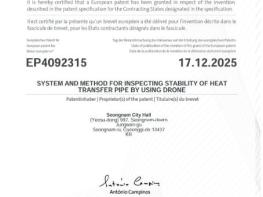 성남시가 자체 개발한 ‘드론을 이용한 열수송관 안정성 검사 시스템’이 유럽특허(등록번호 EP4092315) 등록을 완료했다고 밝혔다. 이는 시 최초의 해외특허 등록 사례로, 지식재산의 해외 권리화를 통해