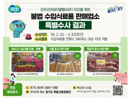 경기도 특별사법경찰단은 아프리카돼지열병(ASF)의 국내 유입·확산 방지를 위해 수입식료품 판매업소를 수사한 결과, 미신고 수입식품 판매 등 총 13건을 적발했다고 11일 밝혔다.도는 지난 2월 23일부터 3