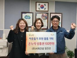 ㈜서희건설은 지난 3월 6일 관고동 행정복지센터를 방문해 지역 내 어려운 이웃을 위해 사용해 달라며 온누리상품권 100만 원을 기탁했다.이번에 기탁된 온누리상품권은 관내 저소득 가구 20세대에 전달될