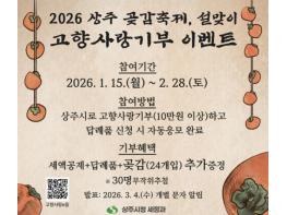 상주시는 2026 상주곶감축제 및 설 명절을 맞이하여 1월 15일부터 2월 말까지 고향사랑기부 이벤트를 실시한다.참여 방법은 고향사랑e음 홈페이지 또는 전국 NH농협은행(지역 농축협 포함) 창구를 통해 ‘상