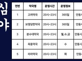 안동시는 시민의 의약품 접근성을 높이고 심야 시간대 의료 공백을 해소하기 위해 1월 1일부터 공공심야약국을 기존 2개소에서 5개소로 확대 지정해 운영 중이다.2025년 한 해 동안 심야약국으로 용상동 ‘